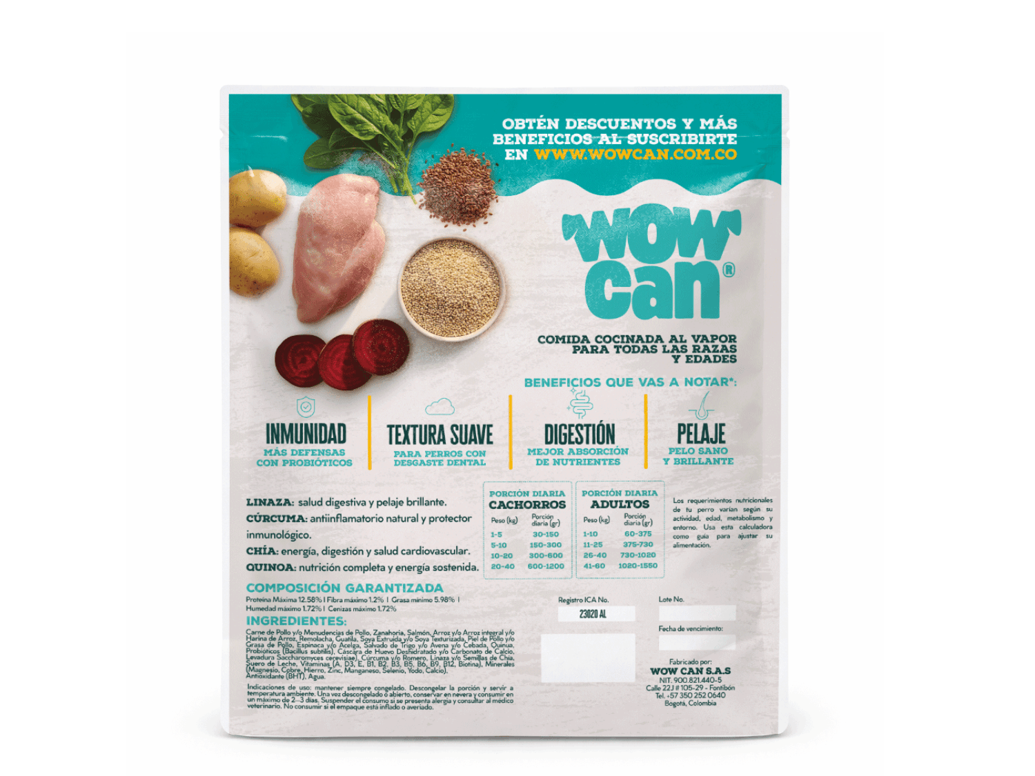 Carne de res, vísceras de res, papa, melón, remolacha, maíz procesado, soya, alfalfa, quínoa, cúrcuma, ajo, extracto de concha de camarón, semillas de chía, semillas de linaza, vitaminas y minerales.